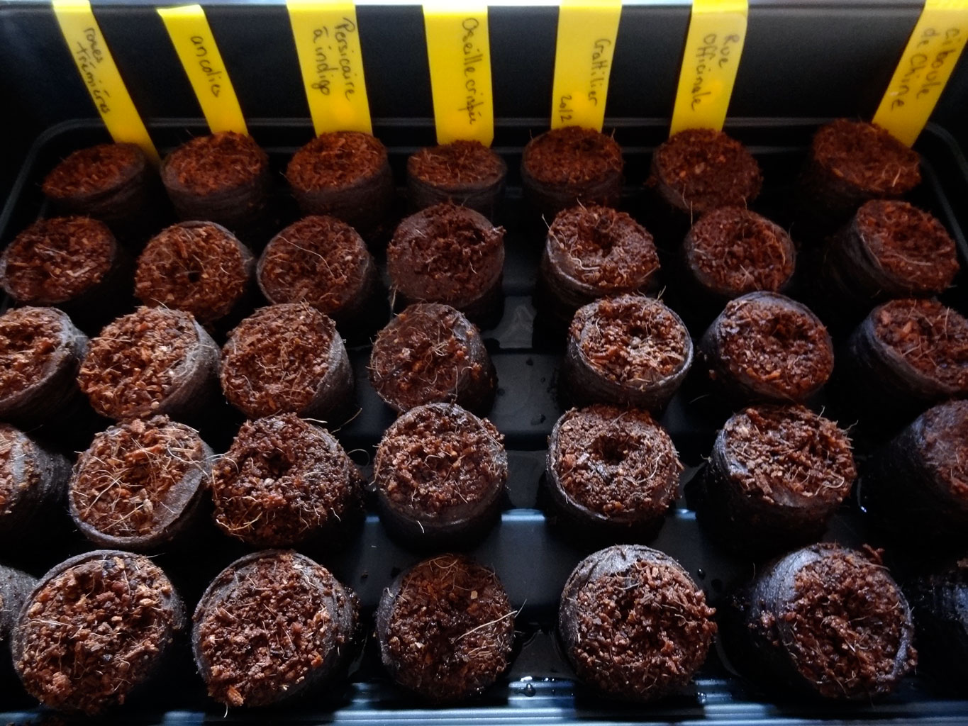 Il n'y a pas encore beaucoup de plantes au jardin, j'ai commencé les premiers semis à l'abri, en espèrant quelques jeunes pousses pour le 24 février...En piochant dans les sachets de graines, je me suis décidée pour quelques plantes tinctoriales, achetées cet été au