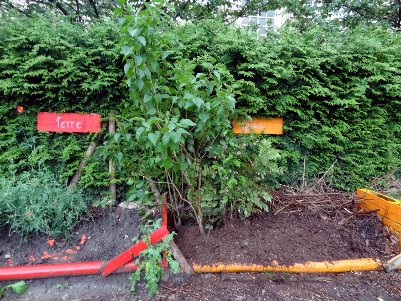 Eh oui, le 21 juin, nous avons fêté l'été au jardin, sous la pluie... Peu de monde donc pendant cette permanence, à part les fidèles qui sont venus pique-niquer avec nous entre 2 averses! Nous avons rencontré un nouveau voisin qui se plaît bien à jouer dans nos plates-bandes et les radis plantés par les enfants ont bien poussé, nous avons éclairci les semis afin qu'ils grandissent à leur aise.Suite à l'alerte orange de météo France, nous avons dû reporter la séance de jardinage prévue avec le centre de loisirs maternels Saint-Just pour la première semaine de juillet. Mais la journée n'a pas été vaine: les travaux qui ont commencé dans la cité Cochennec nous ont permis de récupérer quelques arbustes qui allaient passer de vie à trépas! 2 ouvriers, à notre demande, ont accepté gentiment de déterrer délicatement les arbustes avec la pelleteuse(on ne se refuse rien!) et de nous apporter un peu de terre. La pluie battante nous a interrompues dans notre séance de réintroduction des plantes au jardin, nous espèrons pouvoir récupérer les autres mardi matin. En attendant, nous avons enfoui leurs racines dans le bac à paillis pour les protéger d'une éventuelle sécheresse ce week-end...